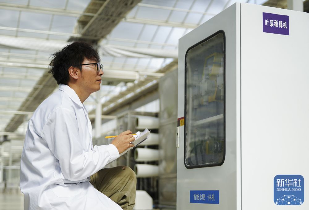 ↑ 6月25日,在新疆阿克蘇地區(qū)庫車市甬庫同心村智慧農(nóng)業(yè)植物工廠,工作人員在監(jiān)測記錄智能水肥一體機(jī)運行情況。