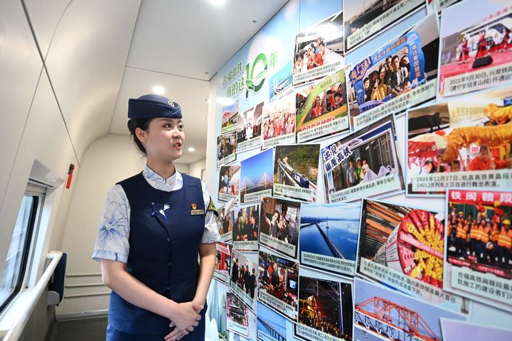 6月25日,中國(guó)鐵路南昌局集團(tuán)有限公司福州客運(yùn)段列車(chē)長(zhǎng)李曉若在 G3089次動(dòng)車(chē)上介紹合福高鐵開(kāi)通十年來(lái)留下的美好故事。