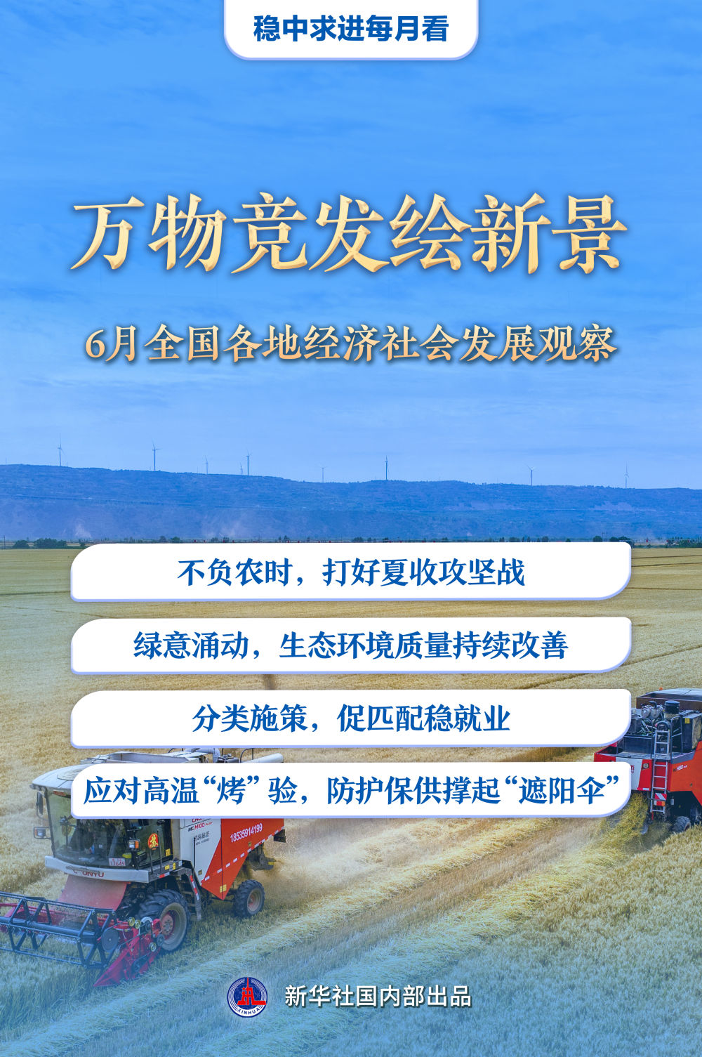 6月仲夏,萬(wàn)物豐茂。廣袤農(nóng)田上,“三夏”生產(chǎn)進(jìn)入關(guān)鍵階段;綠水青山間,低碳發(fā)展不斷繪就新圖景;全力穩(wěn)就業(yè),政府、企業(yè)與高校同頻共振;高溫“烤”驗(yàn)下,做好各項(xiàng)保障工作……上半年收官之月,各地各部門(mén)統(tǒng)籌推進(jìn)穩(wěn)增長(zhǎng)、促改革、惠民生舉措,推動(dòng)經(jīng)濟(jì)社會(huì)沿著高質(zhì)量發(fā)展之路穩(wěn)步前行。