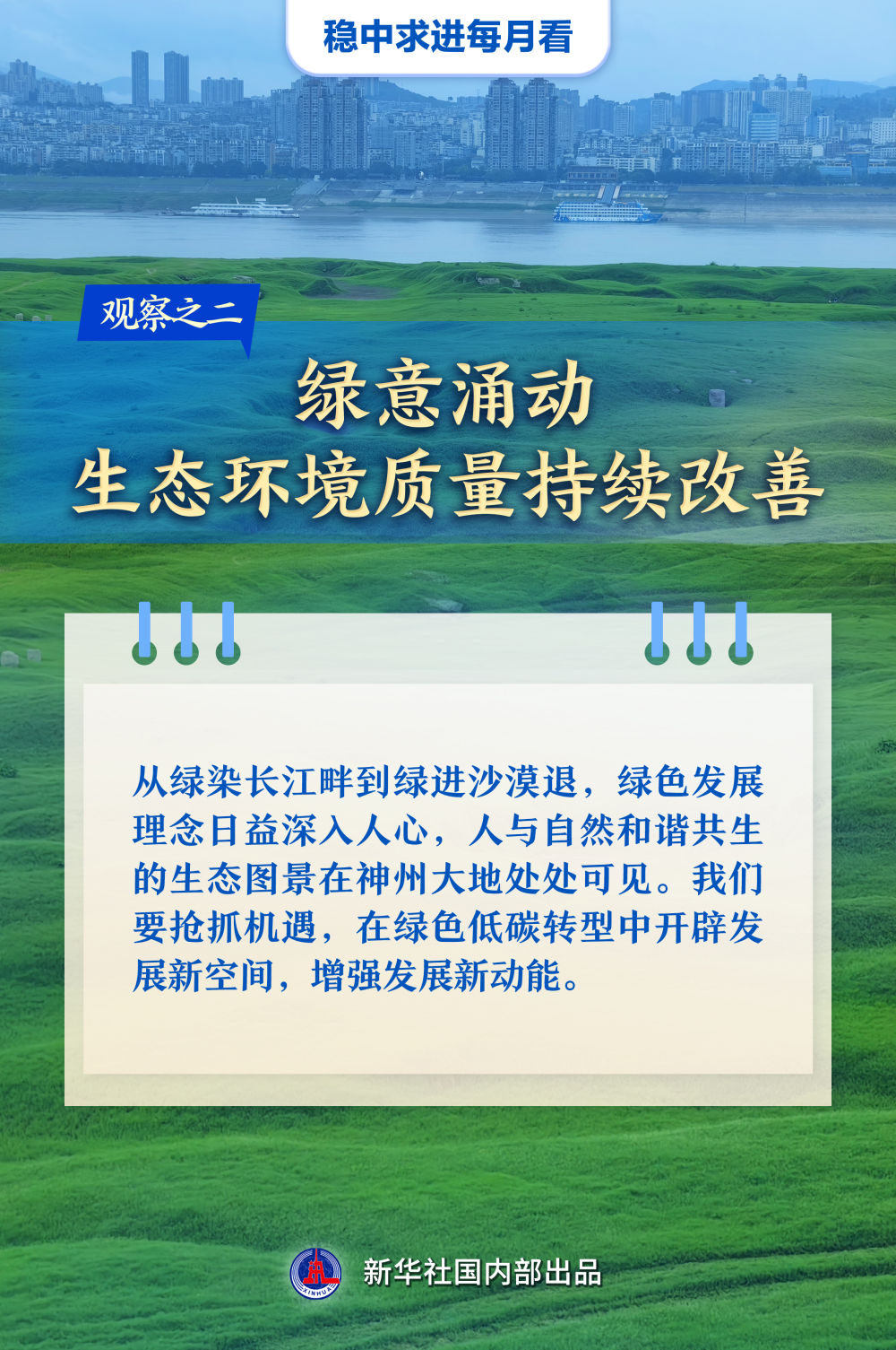 【記者觀察】從綠染長(zhǎng)江畔到綠進(jìn)沙漠退,綠色發(fā)展理念日益深入人心,人與自然和諧共生的生態(tài)圖景在神州大地處處可見(jiàn)。我們要搶抓機(jī)遇,在綠色低碳轉(zhuǎn)型中開(kāi)辟發(fā)展新空間,增強(qiáng)發(fā)展新動(dòng)能。
