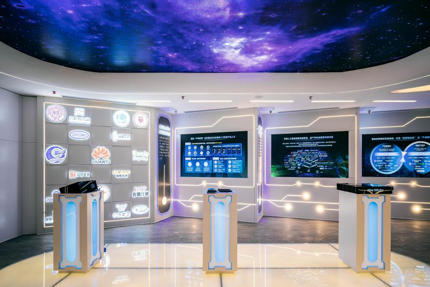 胡建龍(左一)向參觀者介紹AIPA算法中樞(央廣網(wǎng)發(fā) 企業(yè)供圖)