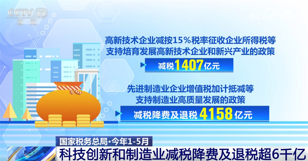 數(shù)據(jù)顯示,今年1—5月,現(xiàn)行支持科技創(chuàng)新和制造業(yè)發(fā)展的主要政策減稅降費及退稅達6361億元。其中,高新技術(shù)企業(yè)減按15%稅率征收企業(yè)所得稅等支持培育發(fā)展高新技術(shù)企業(yè)和新興產(chǎn)業(yè)的政策減稅1407億元;先進制造業(yè)企業(yè)增值稅加計抵減等支持制造業(yè)高質(zhì)量發(fā)展的政策減稅降費及退稅4158億元。