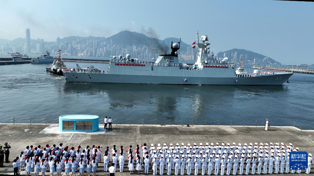 儀式結(jié)束后,湛江艦、運(yùn)城艦響起清脆的海軍笛,官兵們?cè)谙线叿謪^(qū)列隊(duì),向碼頭上的人群揮手致意,兩艘艦艇駛離昂船洲軍營(yíng)碼頭,前往預(yù)定海域與山東艦、延安艦會(huì)合。香港特區(qū)直升機(jī)、船隊(duì)一路引航伴航,護(hù)送編隊(duì)駛出區(qū)界。