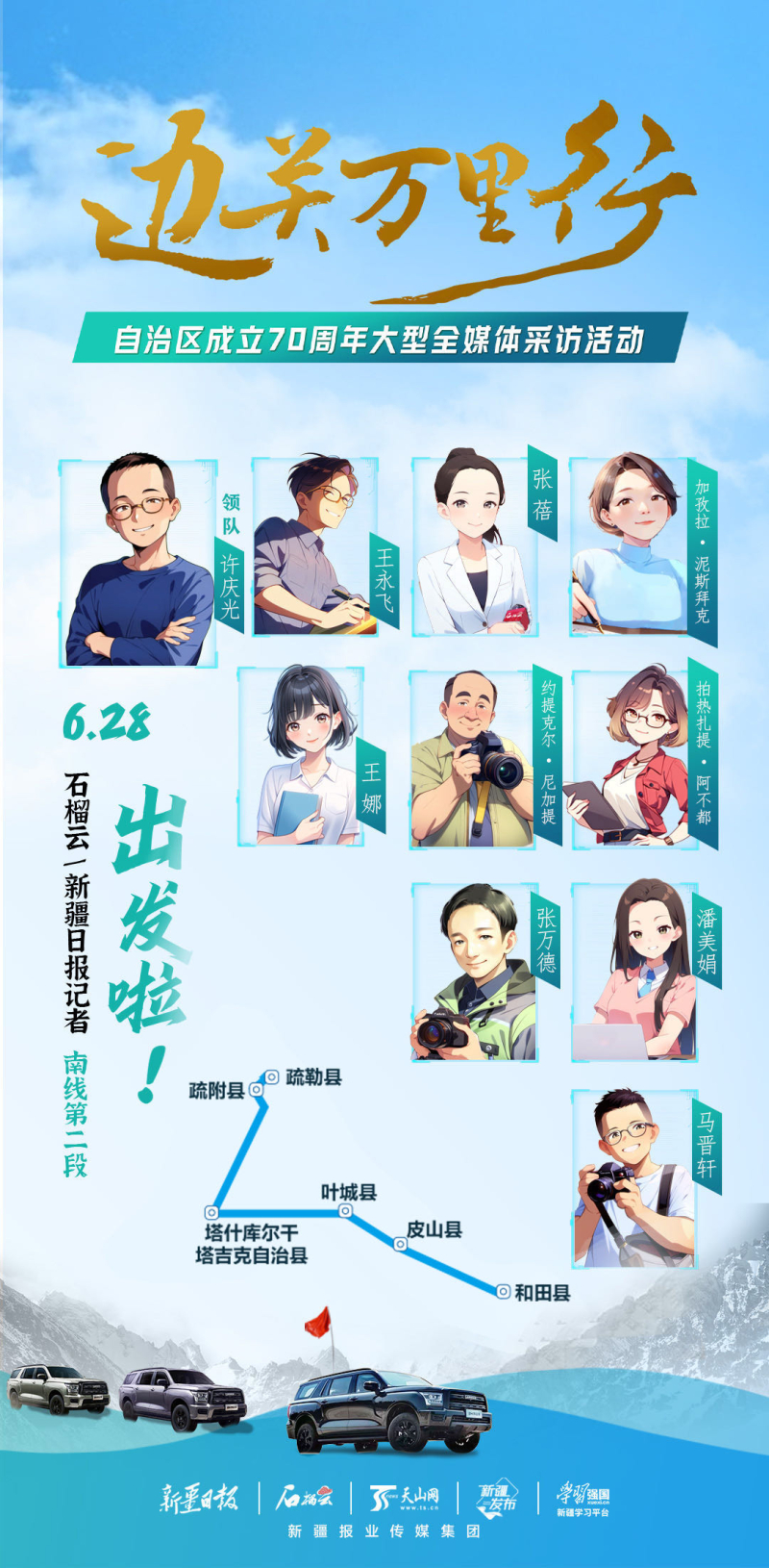 從6月29日開始,“邊關(guān)萬(wàn)里行——自治區(qū)成立70周年大型全媒體采訪活動(dòng)”南線采訪團(tuán)隊(duì)先后前往喀什市、疏附縣、疏勒縣、伽師縣、塔什庫(kù)爾干塔吉克自治縣、葉城縣等地進(jìn)行采訪。從喀什古城到農(nóng)家小院,從城區(qū)到工業(yè)園區(qū),從邊境派出所到紅其拉甫國(guó)門……記者們一直在路上記錄70年來(lái)的發(fā)展變遷。