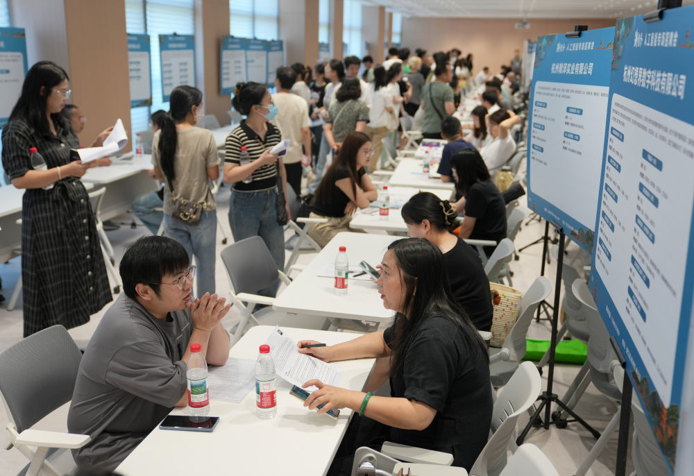 6月28日,求職者與招聘代表在2025年杭州市人工智能專場招聘會(huì)上洽談。新華社記者 韓傳號(hào) 攝