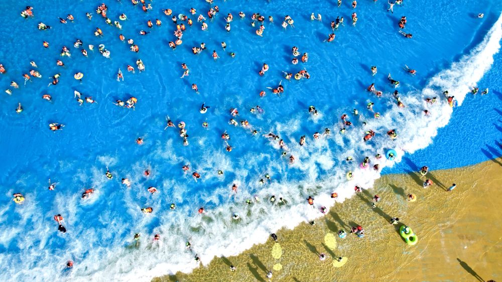 7月5日,浙江省湖州市長興縣太湖圖影旅游度假區(qū)龍之夢(mèng)樂園嬉水世界,游客親水消暑(無人機(jī)照片)。新華社發(fā)(吳拯 攝)