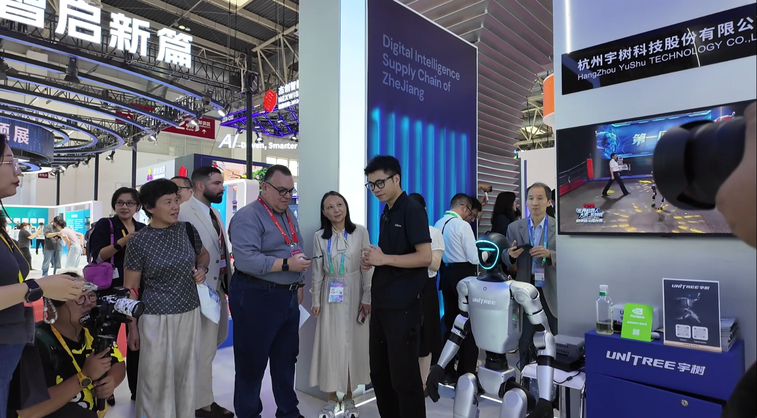 在第三屆鏈博會上,外國觀眾在浙江專區(qū)向宇樹科技工作人員咨詢。(央廣財經記者黃昂瑾 攝)