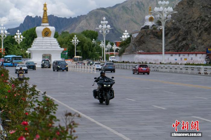 7月21日,一位騎士騎著重型摩托車途經(jīng)拉薩北京中路白塔附近。中新社記者 江飛波 攝