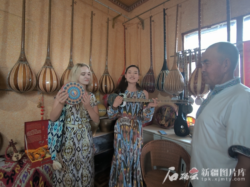 7月28日,在新和縣依其艾日克鎮(zhèn)加依村,俄羅斯籍網(wǎng)絡(luò)達(dá)人梅麗莎(左)和網(wǎng)絡(luò)名人古麗皮亞·買買提依明(中)正在體驗(yàn)民間手工樂器。石榴云/新疆日?qǐng)?bào)記者 甘興華攝