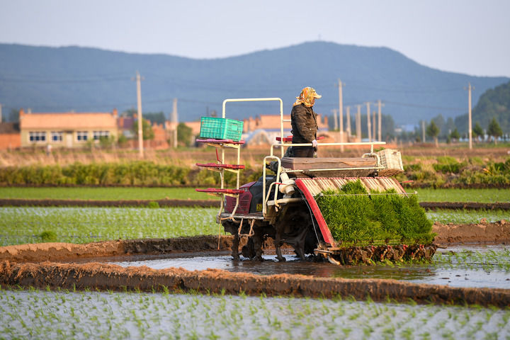 在吉林省吉林市永吉縣鑫豐種植農(nóng)民專(zhuān)業(yè)合作社,農(nóng)民駕駛農(nóng)機(jī)進(jìn)行水稻插秧(2025年5月26日攝)。新華社記者 張楠 攝