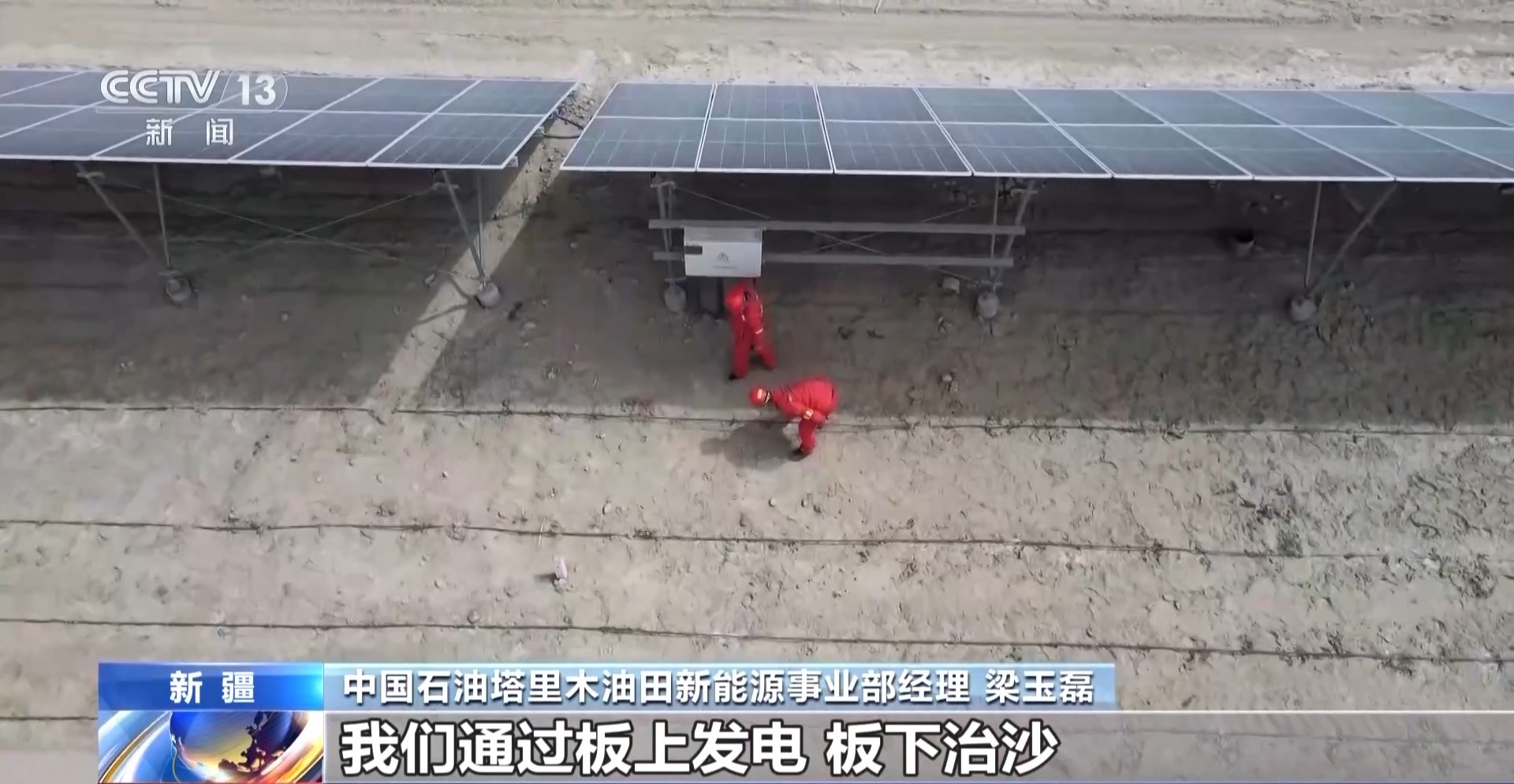 中國石油塔里木油田新能源事業(yè)部經(jīng)理 梁玉磊:我們通過板上發(fā)電、板下治沙,建設(shè)光伏方陣32個,固沙面積達(dá)到4000畝。有效改變了小環(huán)境風(fēng)速,形成“發(fā)電-固沙-惠民”一體模式。