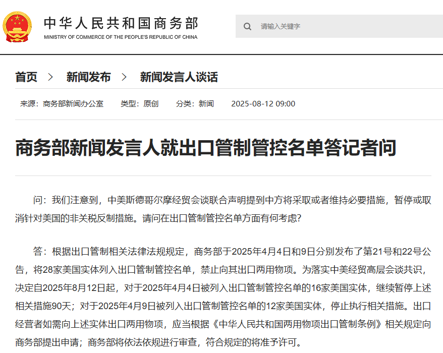 答:根據(jù)出口管制相關法律法規(guī)規(guī)定,商務部于2025年4月4日和9日分別發(fā)布了第21號和22號公告,將28家美國實體列入出口管制管控名單,禁止向其出口兩用物項。為落實中美經(jīng)貿(mào)高層會談共識,決定自2025年8月12日起,對于2025年4月4日被列入出口管制管控名單的16家美國實體,繼續(xù)暫停上述相關措施90天;對于2025年4月9日被列入出口管制管控名單的12家美國實體,停止執(zhí)行相關措施。出口經(jīng)營者如需向上述實體出口兩用物項,應當根據(jù)《中華人民共和國兩用物項出口管制條例》相關規(guī)定向商務部提出申請;商務部將依法依規(guī)進行審查,符合規(guī)定的將準予許可。