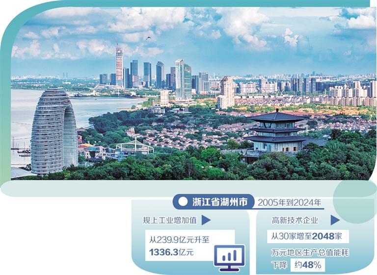 數據顯示,2005年到2024年,湖州規(guī)上工業(yè)增加值從239.9億元升至1336.3億元,高新技術企業(yè)從30家增至2048家,萬元地區(qū)生產總值能耗下降約48%。