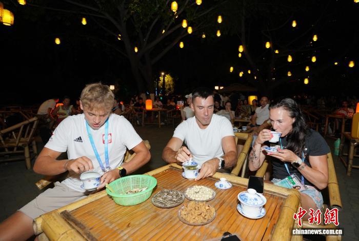 8月6日晚,成都世運(yùn)會(huì)外籍運(yùn)動(dòng)員等在成都望江樓公園品成都蓋碗茶?!≈行律缬浾?安源 攝