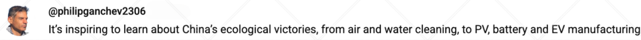 網(wǎng)友@philipganchev2306表示,“從空氣和水凈化到光伏、電池和電動汽車制造,了解中國在生態(tài)領(lǐng)域取得的成就令人鼓舞?!?/p>