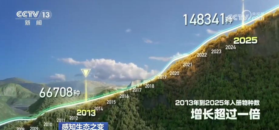 如今,《中國(guó)生物物種名錄》上“入冊(cè)”的生物種數(shù),從2013年的6.7萬(wàn)種增長(zhǎng)到2025年的14.8萬(wàn)種,增長(zhǎng)超過一倍。近500種野生動(dòng)植物的受威脅等級(jí)出現(xiàn)下降。