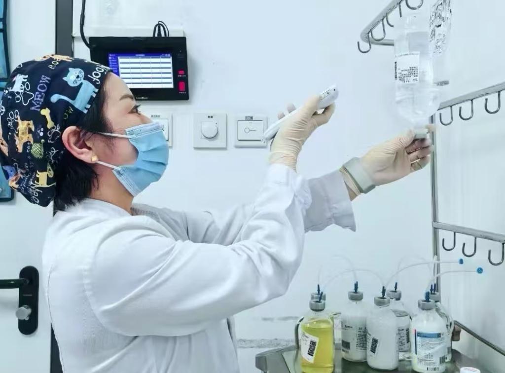 北京大學(xué)腫瘤醫(yī)院臨床試驗病區(qū),值班護士正在核對藥物。(受訪者供圖)