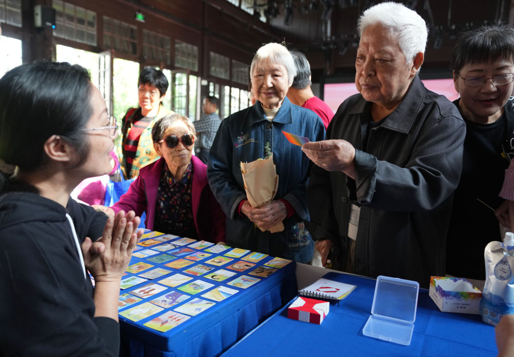 2024年10月11日,在杭州市西湖區(qū)北山街道舉行的情暖桑榆——孝親敬老服務(wù)進(jìn)社區(qū)活動中,志愿者面向社區(qū)居民開展心理健康服務(wù)。新華社記者 韓傳號 攝