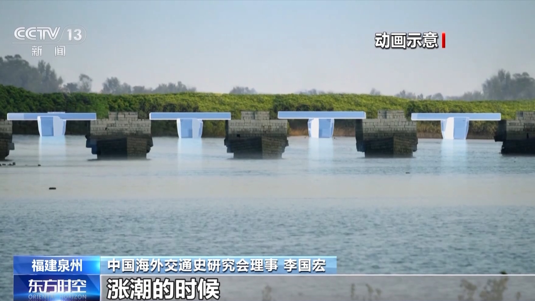 中國海外交通史研究會(huì)理事 李國宏:這就是洛陽橋在建造的時(shí)候運(yùn)用的浮運(yùn)架梁法,漲潮的時(shí)候先把巨大的石板安放在船上,慢慢駛向兩個(gè)橋墩之中,落潮了,巨大的石板就穩(wěn)定地安放在橋墩上,船也趁著落潮安全的駛離橋墩。