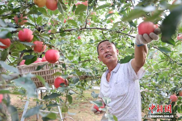 圖為陜西省延安市洛川縣的果農(nóng)正在采摘早熟蘋果?!±钸M(jìn) 攝