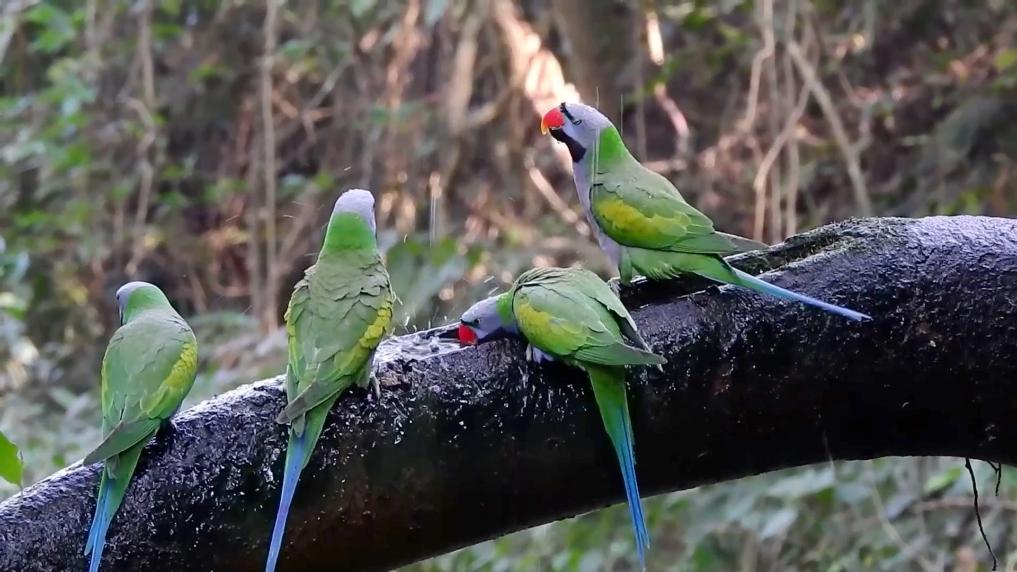 近日,在云南省普洱市思茅區(qū)思茅港鎮(zhèn)茨竹林村芒壩村民小組,成群的國(guó)家二級(jí)保護(hù)動(dòng)物大紫胸鸚鵡飛臨村子周?chē)拈艠?shù)嬉戲。