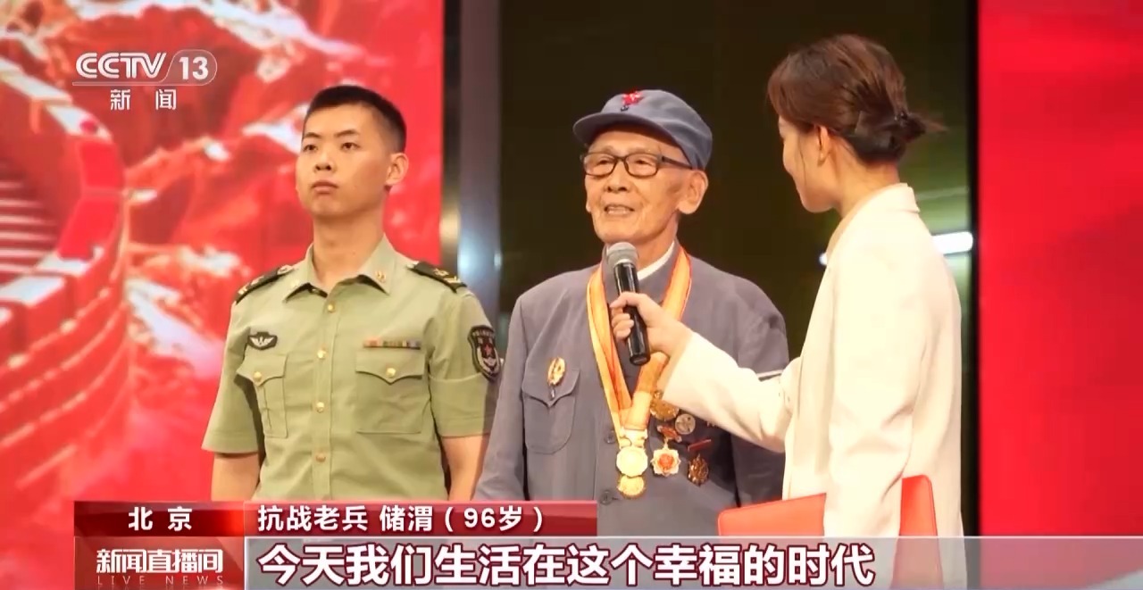 抗戰(zhàn)老兵 儲渭(96歲):我當兵的時候不到15歲,現(xiàn)在老戰(zhàn)友已經(jīng)不太多了。經(jīng)歷了14年的抗日戰(zhàn)爭,今天我們生活在幸福的時代,這是黨的關(guān)懷,這是我們不能忘記的。