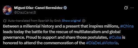 迪亞斯-卡內(nèi)爾在社交媒體上發(fā)文稱,“在綿延千年的歷史與激勵億萬人的當(dāng)下之間,中國今日引領(lǐng)捍衛(wèi)多邊主義與全球治理的斗爭。古巴為支持并踐行這些理念而自豪,并榮幸出席勝利日紀(jì)念活動?!?/p>