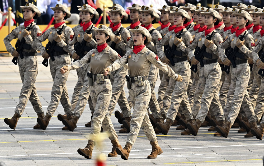 民兵方隊全部由女民兵組成。這是民兵首次亮相以紀念抗戰(zhàn)勝利為主題的閱兵活動。
