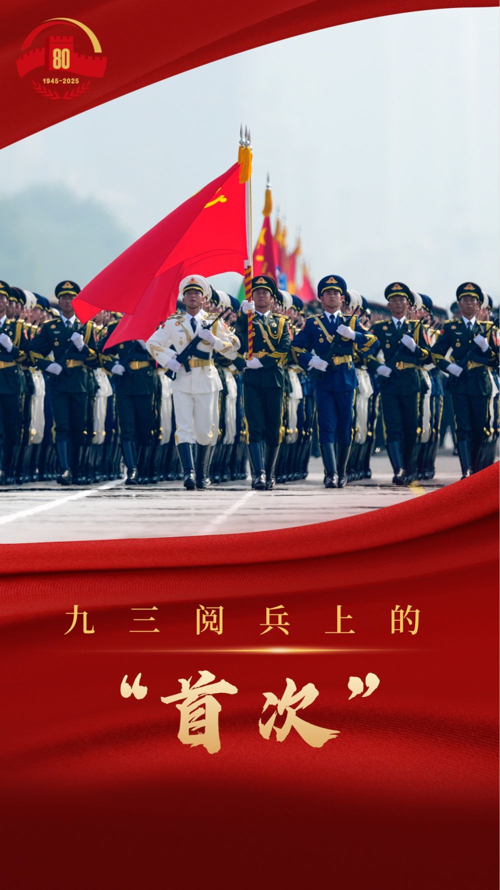 在編排上,設置14個排面寓意中國人民14年抗戰(zhàn)歷程,設置80名禮號手以紀念抗戰(zhàn)勝利80周年。