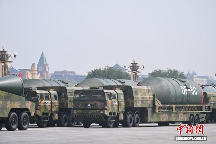 9月3日,紀(jì)念中國人民抗日戰(zhàn)爭暨世界反法西斯戰(zhàn)爭勝利80周年大會在北京隆重舉行。圖為核導(dǎo)彈第二方隊“東風(fēng)-5C”液體洲際戰(zhàn)略核導(dǎo)彈駛過天安門廣場?!≈行戮W(wǎng)記者 趙文宇 攝