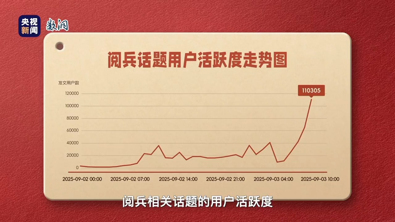 數(shù)據(jù)曲線和觀眾的情緒重疊上揚,開始的瞬間,閱兵相關話題的用戶活躍度飆升到前一天最高值的三倍。