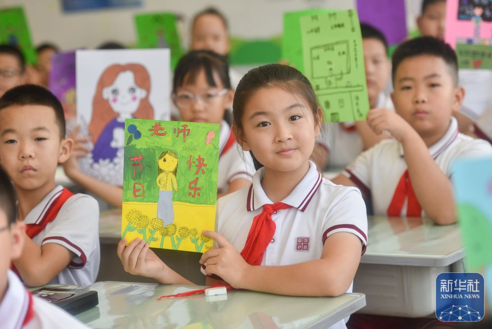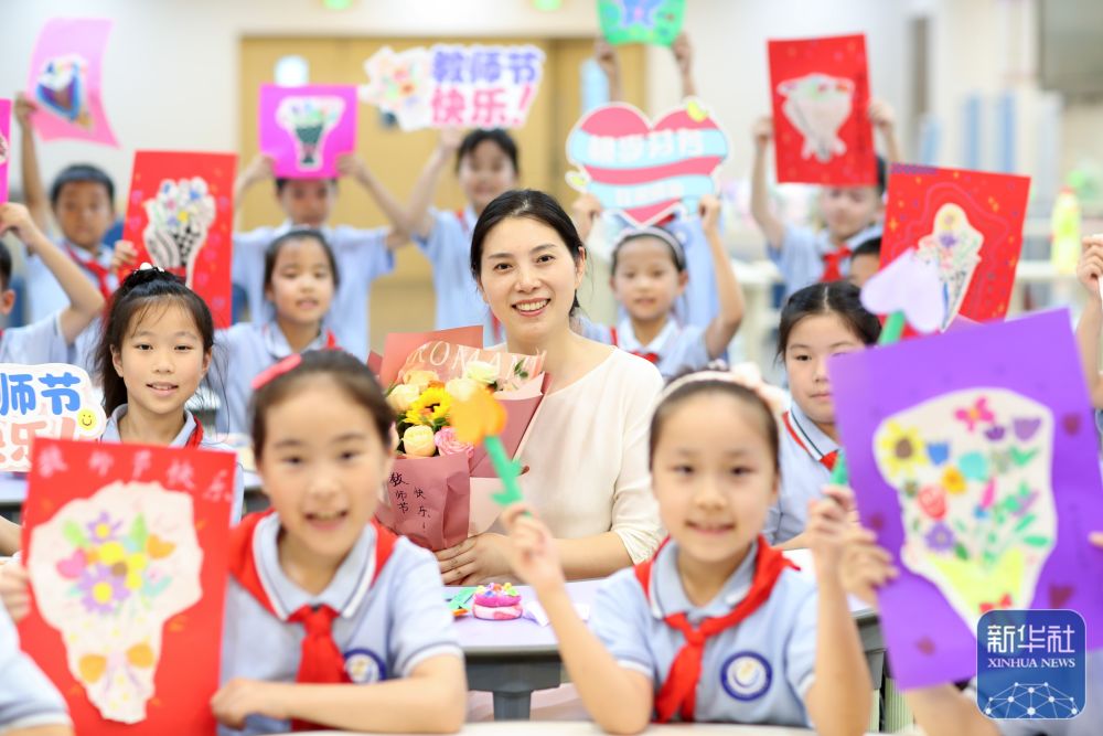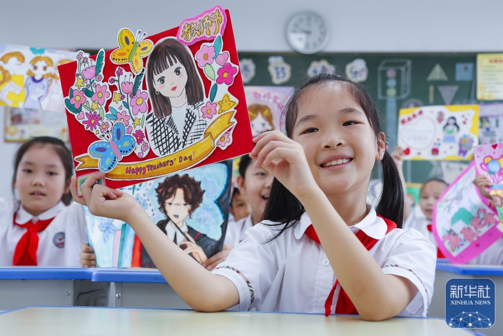 9月9日,在武漢市未來實驗小學(xué)美林校區(qū),學(xué)生為教師送上節(jié)日祝福。新華社發(fā)(趙軍攝)