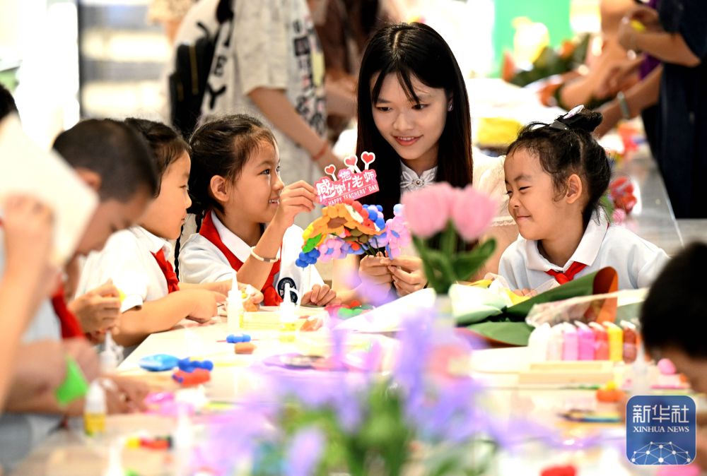 9月9日,在河北省石家莊市柏林莊學(xué)校開展的“黏土做花寄師恩”主題活動中,孩子們用粘土制作花束,為老師送上節(jié)日的祝福。新華社發(fā)(陳其保攝)