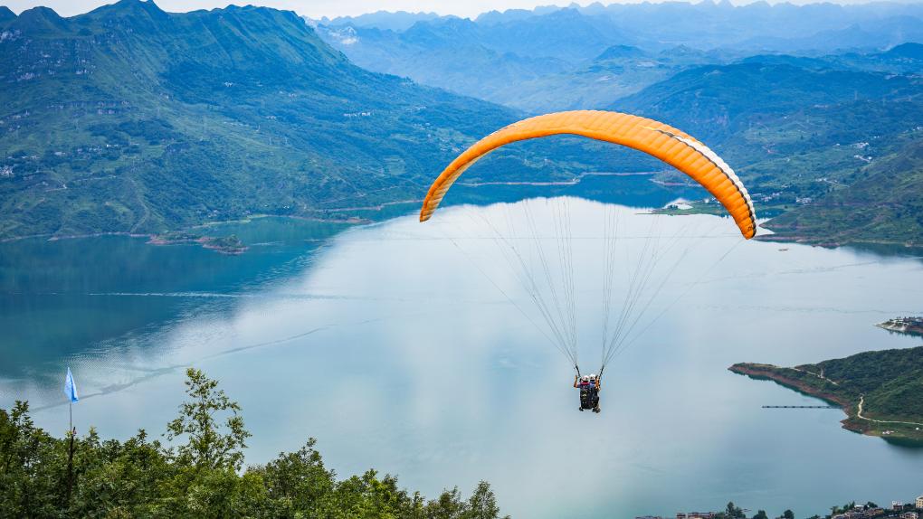 7月9日,游客在教練的陪同下體驗(yàn)低空滑翔飛行?;鑲氵@一低空旅游項(xiàng)目成為了貴州省六盤(pán)水市眾多游客的新選擇。新華社記者 陶亮 攝