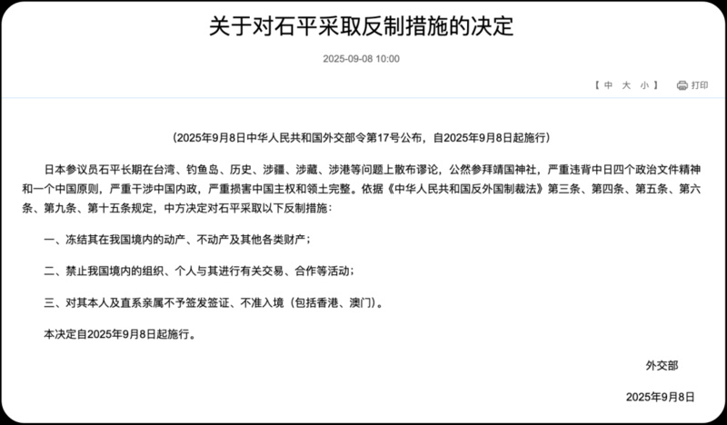 9月8日,中方宣布對日本參議員石平采取反制措施,禁止其進入中國境內(nèi),凍結(jié)其在華資產(chǎn),并限制其與中國的商業(yè)往來。