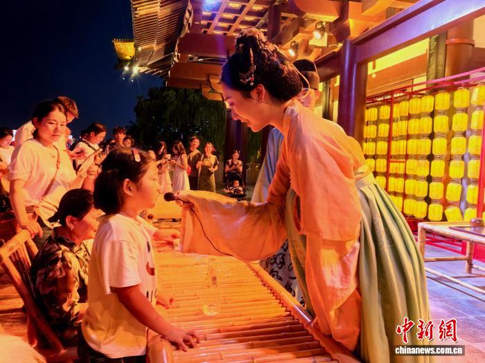 9月5日,長(zhǎng)沙杜甫江閣“喜相逢”唐風(fēng)互動(dòng)夜游活動(dòng)中,演員正在與觀眾互動(dòng)。張雪盈 攝