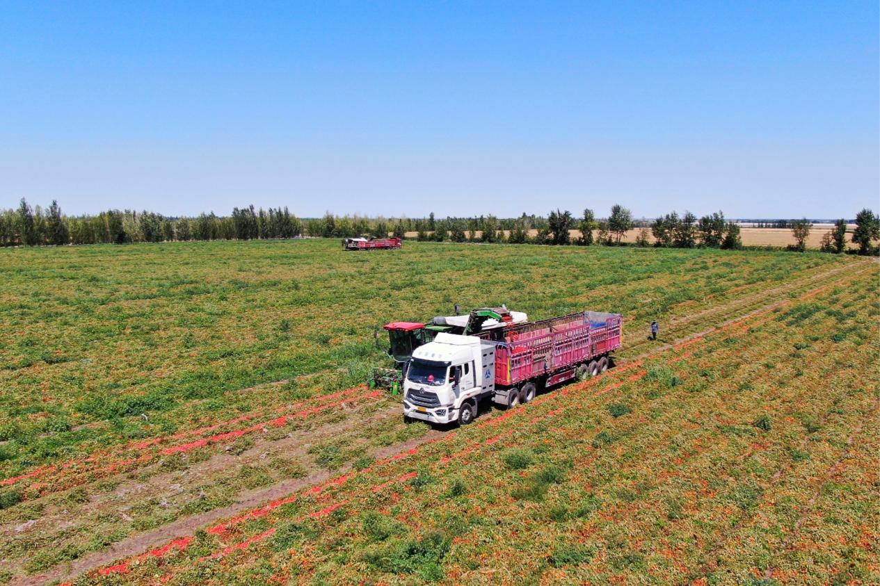 吉木薩爾縣三臺(tái)鎮(zhèn)的1200余畝加工番茄迎來(lái)了豐收季。在羊圈臺(tái)子村,種植戶俞瑞海家的300畝番茄地里,現(xiàn)代化采收機(jī)械正來(lái)回穿梭。