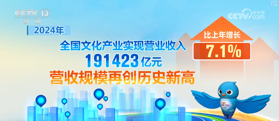 2024年,全國文化產(chǎn)業(yè)實(shí)現(xiàn)營業(yè)收入191423億元,營收規(guī)模再創(chuàng)歷史新高,比上年增長7.1%。2024年,文化服務(wù)業(yè)實(shí)現(xiàn)營業(yè)收入109134億元,比上年增長7.4%,占全部文化產(chǎn)業(yè)營業(yè)收入的比重為57.0%,文化服務(wù)業(yè)對(duì)文化產(chǎn)業(yè)營業(yè)收入增長的貢獻(xiàn)率為59.1%。