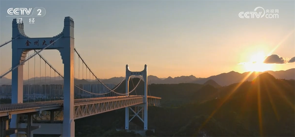 金州大橋位于貴州興義市,是貴州首座設(shè)有城市軌道交通空間與旅游觀光通道的懸索橋?!皹蚺再p落日、橋上瞰山河、橋下觀飛瀑”的立體化旅游新模式,吸引了眾多游客和市民前來(lái)觀景游玩。