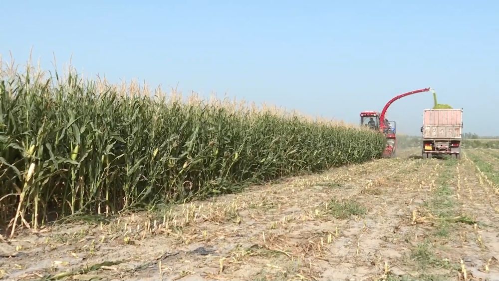 新疆巴音郭楞蒙古自治州焉耆縣的1.5萬畝青貯玉米迎來豐收。在永寧鎮(zhèn)九號渠村,大型青貯收割加工機將一株株玉米從根部割斷,粉碎后拋入集草車。