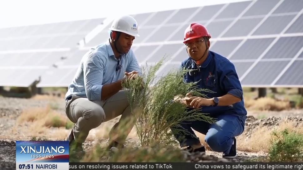 外籍主持人林肯探訪了全球最大的“草光互補(bǔ)”光伏基地——阿合雅光伏產(chǎn)業(yè)園。這片由181萬塊光伏板組成的藍(lán)色海洋,占地493公頃,相當(dāng)于700個(gè)標(biāo)準(zhǔn)足球場。不僅能夠提供滿足約43萬人全年用電需求,還兼具治沙功效。中國華能集團(tuán)烏什光伏電站負(fù)責(zé)人周博表示,這類光伏設(shè)施能夠穩(wěn)固土壤、防止侵蝕,板面凝結(jié)的水珠還可灌溉下方土地,支持植物持續(xù)生長?!案瓯谄孥E”的背后,是國家實(shí)現(xiàn)“雙碳”目標(biāo)而推動(dòng)的生態(tài)與能源的“雙向奔赴”。