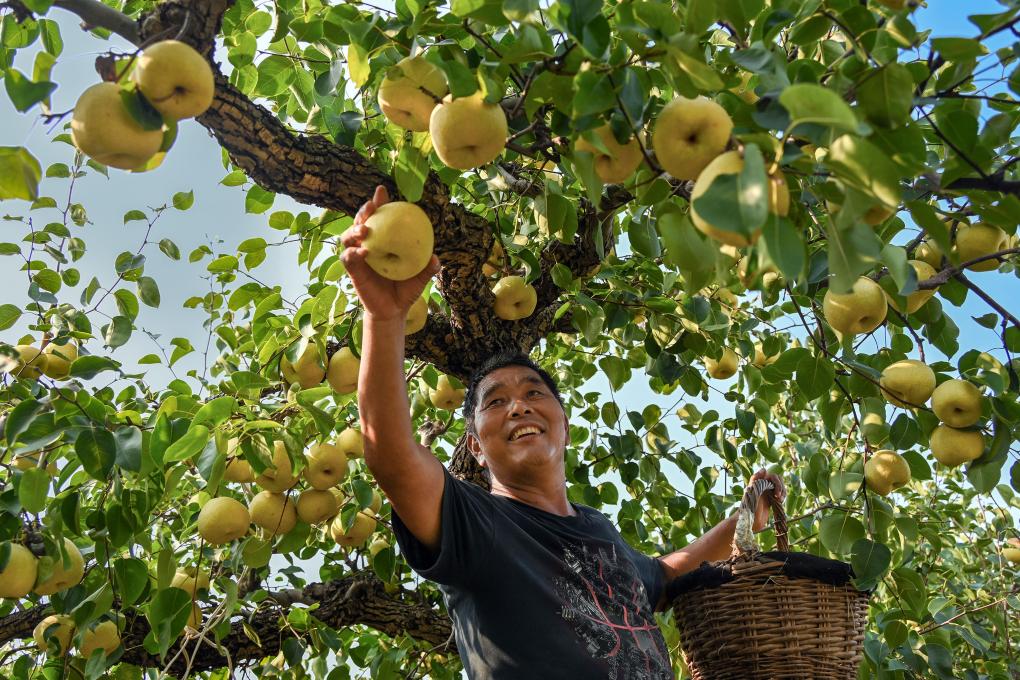 9月15日,在安徽省宿州市碭山縣一處梨園內,梨農在采摘酥梨。新華社發(fā)(崔猛 攝)