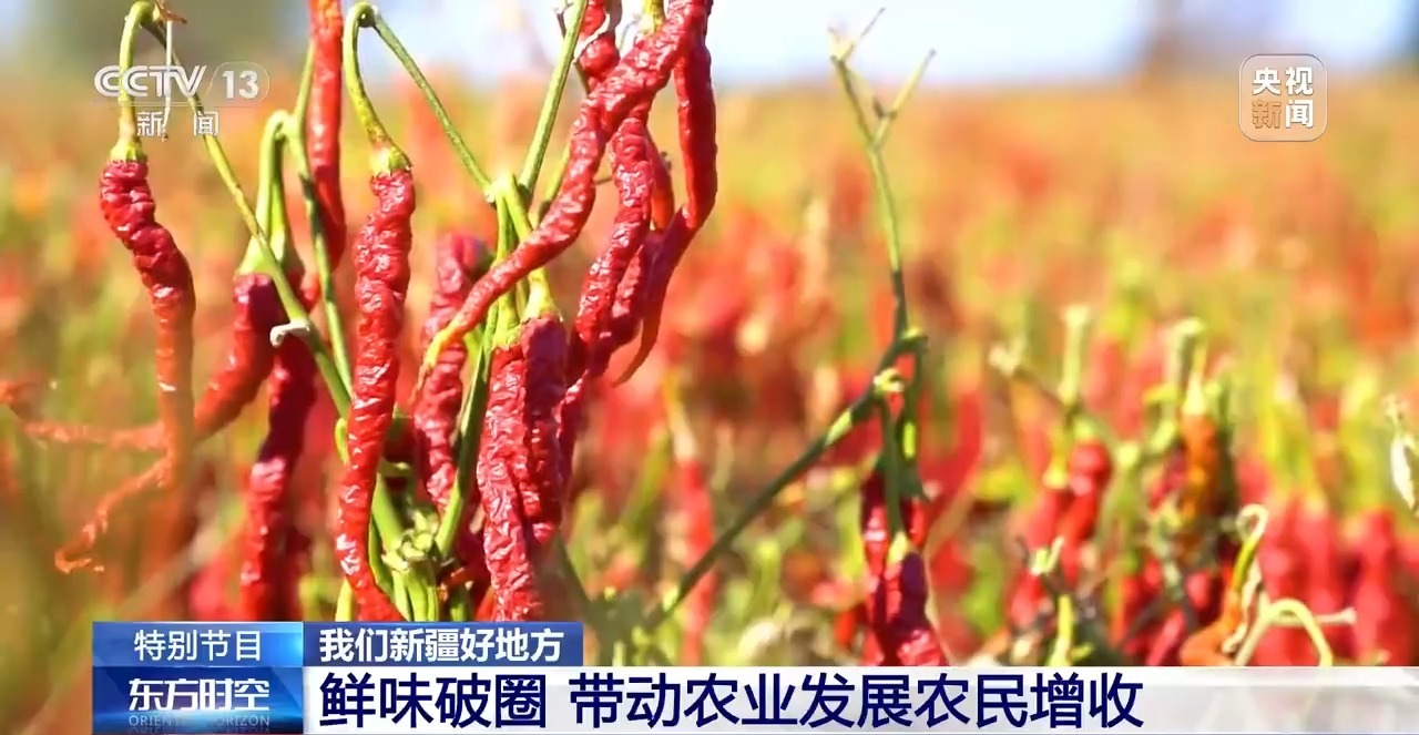 說完了主角,再來說說配菜。這里面的土豆來自博爾通古鄉(xiāng)。最關(guān)鍵的辣椒,是當(dāng)?shù)氐闹饕r(nóng)作物,來自“辣椒之鄉(xiāng)”安集海鎮(zhèn)。過去這里的辣椒只是農(nóng)民零散種植,如今已經(jīng)形成了從育種、種植、加工到銷售的完整產(chǎn)業(yè)鏈。這些辣椒不僅給大盤雞“注入靈魂”,也滿足了全國的餐桌需求,還出口到韓國、日本等地。