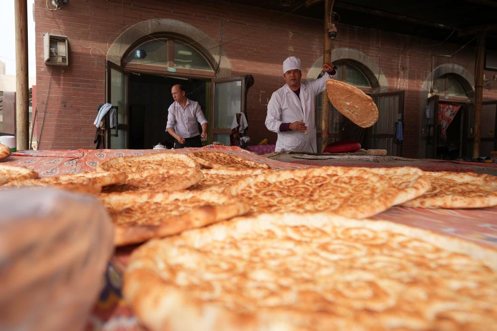 9月19日,達(dá)西村村民肉則·賽麥提(右)在文旅商業(yè)街上制作馕。近年來,達(dá)西村打造文旅商業(yè)街,吸引村民入駐,為村民增收。