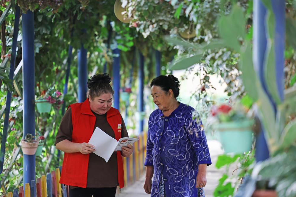 9月18日,達(dá)西村村干部古力帕爾力·克衣木(右)入戶詢問村民生活情況。