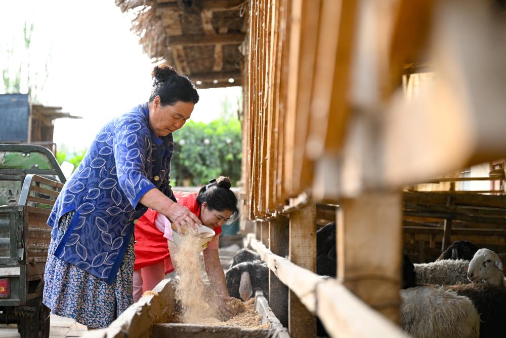 9月18日,達(dá)西村村干部卡麥爾汗·蘇來曼(后)入戶幫助村民喂羊。