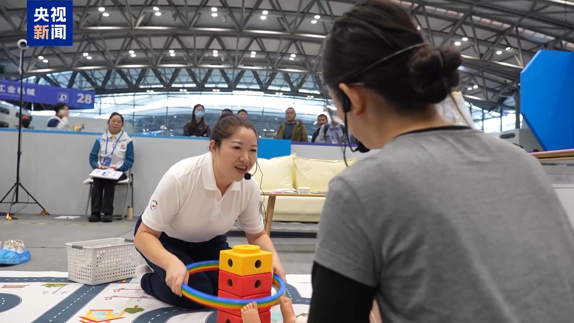 賽場(chǎng)上,一個(gè)個(gè)格子間按照真實(shí)居家場(chǎng)景布置,選手們按照流程,完成從上門拜訪、嬰兒互動(dòng)、游戲設(shè)計(jì)、家長(zhǎng)交流等系列服務(wù)工作。記者注意到,這次比賽創(chuàng)新引入會(huì)哭鬧的智能化模擬嬰兒,選手抱姿不對(duì)、饑餓都會(huì)有數(shù)據(jù)反饋,考驗(yàn)選手的回應(yīng)性照顧能力,同時(shí)邀請(qǐng)了一些嬰幼兒家長(zhǎng)進(jìn)行配合互動(dòng)。