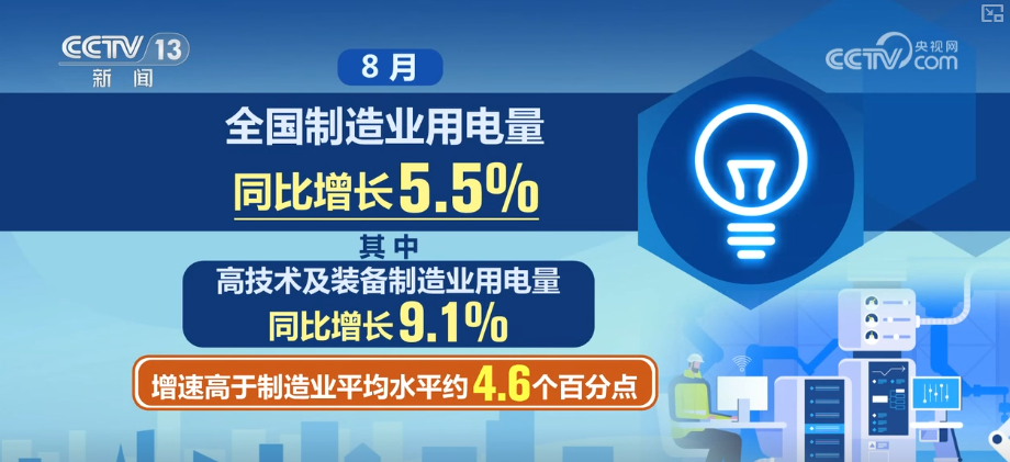 數(shù)據(jù)顯示,8月,全國制造業(yè)用電量同比增長5.5%。其中,高技術(shù)及裝備制造業(yè)用電量同比增長9.1%,增速高于制造業(yè)平均水平約4.6個百分點。
