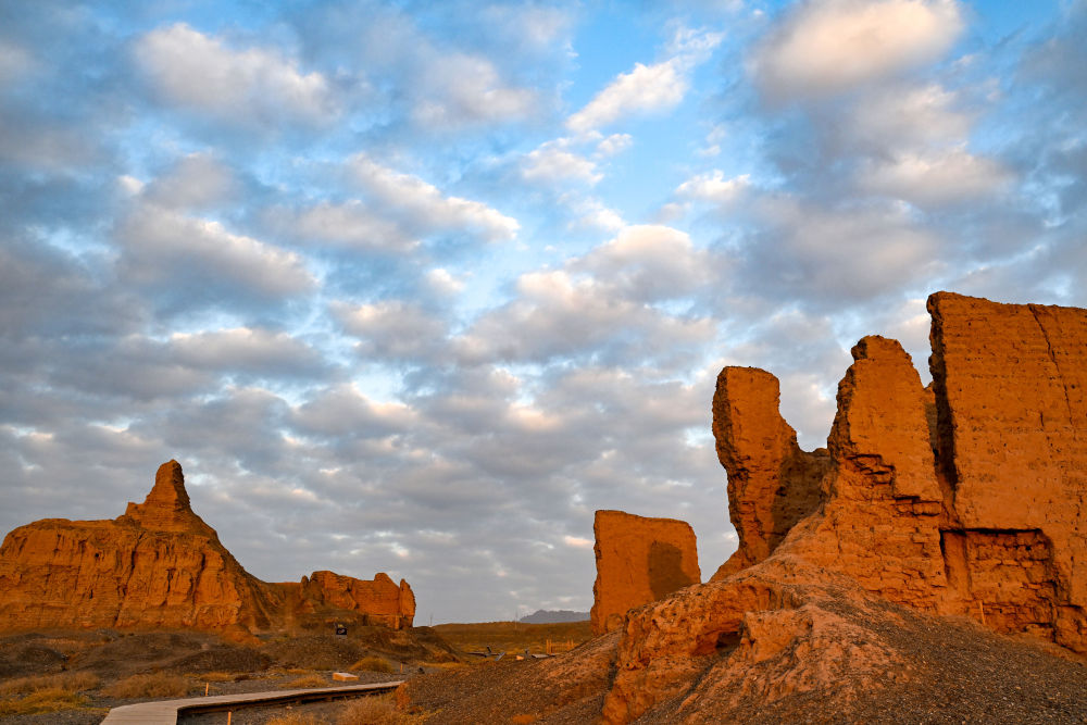 “克孜爾尕哈”意為“紅色哨卡”。夕陽下,這座漢代軍事設(shè)施的夯土墻體被映照得棱角分明,泛著淡淡的金紅色。“站在這里,仿佛看到了當年的烽火傳訊?!币幻慰透锌卣f。