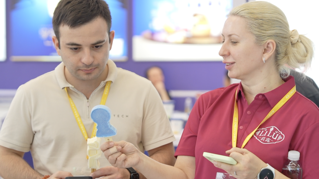 在東北大板品牌展區(qū),蜜瓜、芒果、百香果造型的水果味冰淇淋吸引了眾多客商品嘗,該系列產(chǎn)品遠(yuǎn)銷新西蘭、加拿大、馬來西亞、新加坡等國家和地區(qū)。